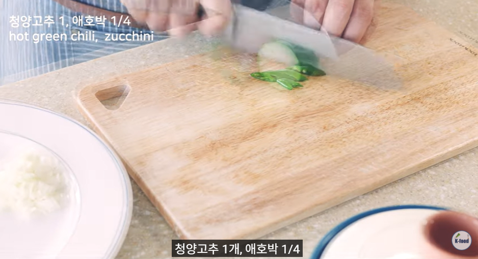 끓기 시작하면 애호박, 청양고추와 **다진 마늘 1큰술**을 넣고, 마지막으로 순두부를 국자로 떠서 조심스럽게 넣어줍니다.