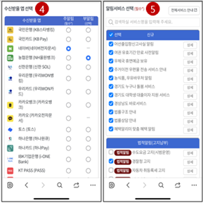 - 주요 모바일 앱: 네이버, 카카오(카카오톡), 토스, KB스타뱅킹, KB Pay, 신한SOL, 우리WON뱅킹, 우리WON카드, 카카오뱅크, 하나원큐, 하나Pay, i-ONE Bank, NH올원뱅크, PASS(SKT, KT, LGU+), SKT(Tworld) 등