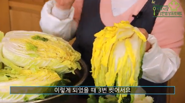 절여진 배추는 수분이 많이 빠져나왔기 때문에 잔여 소금을 제거하기 위해 **찬물에 세 번** 깨끗하게 헹궈줘야 합니다.
