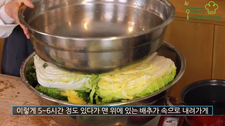 - 준비된 소금물에 배추를 넣고 6시간마다 위아래를 뒤집어줍니다.