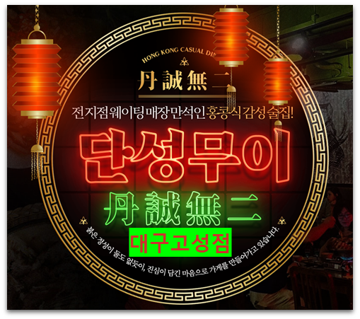 대구에서 다시 한번 그 낭만을 느껴보고 싶다면, 단성무이 대구고성점이 정답입니다. 추억 속 홍콩 영화의 한 장면처럼, 깊은 분위기와 맛으로 당신의 향수를 자극할 공간입니다.