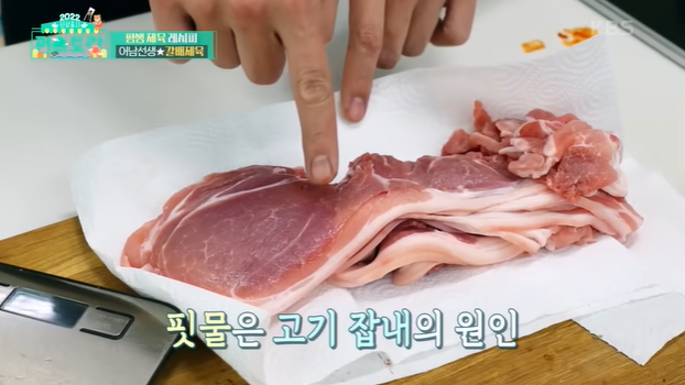- **타월 이용:** 고기를 넓게 펼친 후 **키친타월을 넉넉히** 깔아 꾹꾹 눌러 핏물을 흡수시킵니다.