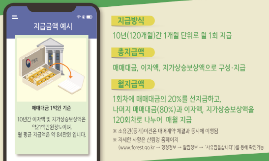 산지연금의 지급 방식은 매월 일정 금액이 산주에게 지급되는 형태입니다. 매매가 이루어진 후, 산림청은 산주와 계약을 체결하고, 매월 정해진 날짜에 연금을 지급합니다.