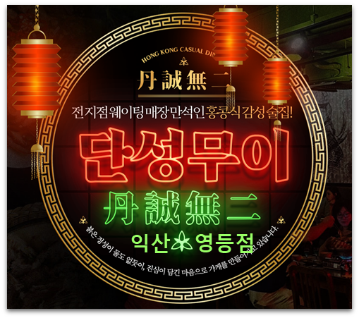 익산의 밤을 걷다 우연히 발견한 듯한 곳, 바로 단성무이 익산영등점입니다. 문을 여는 순간, 붉은 조명과 낭만적인 분위기가 당신을 홍콩의 밤거리로 안내합니다.