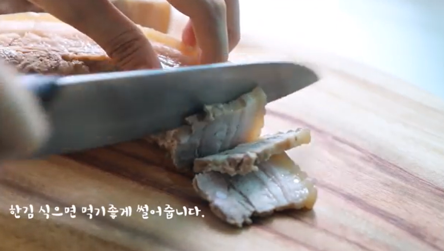 건져낸 후 **5~10분** 정도 상온에서 잠시 두었다가 썰어야 육즙이 고기에 안정되어 훨씬 촉촉하고 부드러운 수육을 맛볼 수 있습니다.
