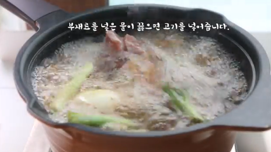 - 물이 끓으면 핏물 뺀 고기를 통째로 넣고 **센 불**에서 10분간 끓여 표면을 익힙니다.