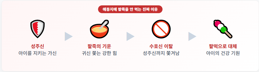 예로부터 전해오는 무서운 속설 중 하나입니다. 애동지에는 집안의 수호신인 '성주신'이 어린아이들을 특별히 보살피는 시기라고 믿었습니다. 그런데 팥죽의 강한 붉은색과 기운은 귀신을 쫓는 힘이 너무 강해, 아이들을 지켜주는 성주신까지 집 밖으로 몰아낸다고 생각했습니다.