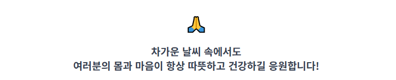 차가운 날씨 속에서도 여러분의 몸과 마음이 항상 따뜻하고 건강하길 진심으로 응원합니다. 지혜로운 겨울 준비로 올 한 해의 마무리를 건강하게 장식하세요!