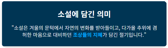 24절기는 태양의 황도 운동을 기준으로 1년을 24등분 한 것으로, 농경사회에서 농사의 때를 정하는 중요한 이정표였습니다. 소설은 가을걷이가 끝난 후 김장 준비를 본격적으로 시작하며, 땔감을 장만하는 등 월동 준비에 박차를 가하던 시기였습니다.