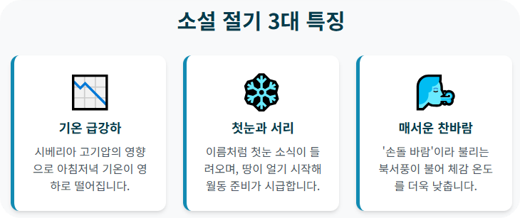- 기온 급강하: 소설 무렵에는 시베리아 고기압의 영향으로 차가운 대륙성 기단이 확장하면서 기온이 큰 폭으로 떨어집니다. 아침저녁으로는 영하의 기온을 보이는 곳이 많아집니다.