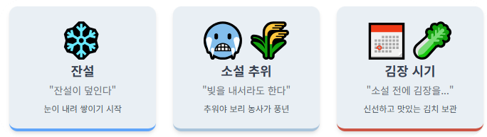 이는 아직 한겨울처럼 폭설이 내리는 시기는 아니지만, 북쪽에서 차가운 기운이 내려와 비가 눈으로 바뀌기 시작하는 때라는 뜻이죠. 서리가 내리고 얼음이 얼기 시작하며, 간혹 첫눈을 만날 수 있어 겨울의 문턱에 들어섰음을 실감하게 합니다.