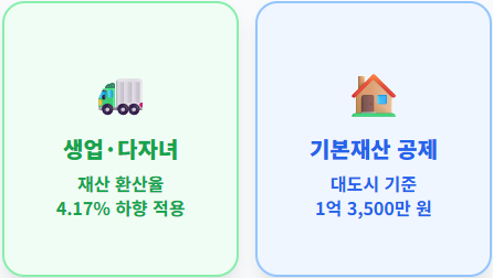 - 🚀 자동차 예외 기준 확대: 2,000cc 미만 생업용 차량(다자녀 가구 포함)은 재산 가액 산정에서 제외되거나 일반재산 환산율(4.17%)이 적용됩니다.