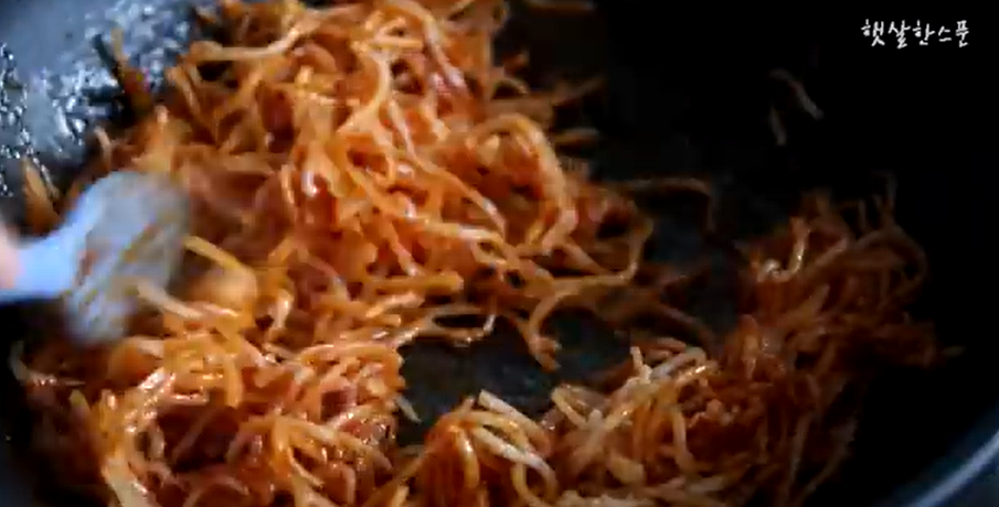 진미채볶음이 딱딱해지는 가장 큰 원인은 **불 위에서 오래 볶기 때문**입니다. 진미채는 이미 익혀 나온 건어물이므로, 양념이 진미채에 살짝 묻는 정도로만 조리하는 것이 비법입니다.
