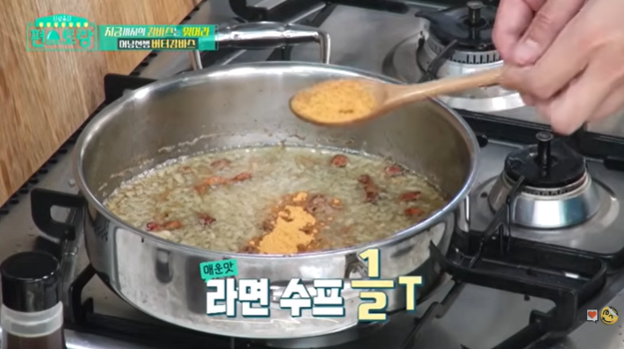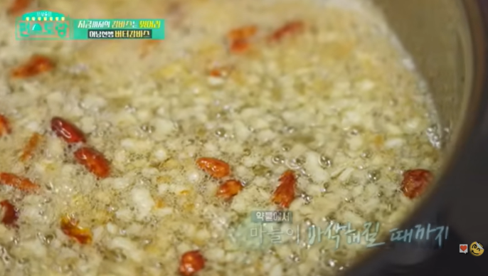 비법 재료 공개! 류수영 님은 감칠맛의 정점으로 라면 스프를 제안합니다. 소금으로만 간을 할 때 느껴지는 밋밋함을 한 번에 잡아주는 역할이죠. 스프의 매콤한 성분이 오일에 녹아들며 새우의 감칠맛과 결합해 최고의 궁합을 자랑합니다.