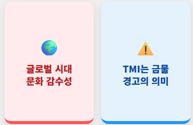 글로벌 시대에 언어만큼 중요한 것이 바로 **'문화의 감수성'**입니다. 우리가 무심코 사용하던 TMI라는 단어가 영어권에서는 상대에게 불쾌함을 주는 경고일 수 있다는 사실을 인지하는 것만으로도, 여러분의 글로벌 대화 지능은 한 단계 높아졌을 것입니다.