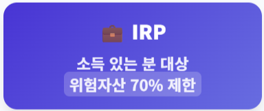 - IRP: 근로자, 자영업자 등 소득이 있어야 가입 가능하며, 안정성을 위해 위험자산 투자가 70%로 제한됩니다.