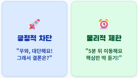 "아, 그 이야기 진짜 흥미로운데 제가 5분 뒤에는 이동을 해야 해서요! 핵심만 딱 듣고 나머지는 다음에 카페에서 길게 들으면 안 될까요?"