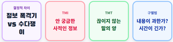 🌸 1. 서론: TMI와 TMT, 왜 구분해야 할까? 🌸 2. TMI(투머치 인포메이션)의 핵심: 내용의 질 🌸 3. TMT(투머치 토커)의 핵심: 말의 양과 속도 🌸 4. 실전! 상황별 TMI vs TMT 구별법 🌸 5. 결론: 센스 있는 대화의 시작1. 서론: TMI와 TMT, 왜 구분해야 할까?