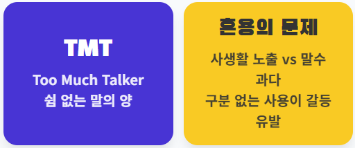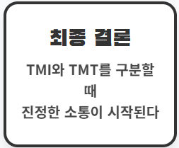 반면 TMT의 핵심 키워드는 '대화 점유율'입니다. 정보 자체가 부적절한 것은 아닐지라도, 혼자서 대화 시간을 독점하며 상대방이 끼어들 틈을 주지 않는 사람을 의미합니다.
