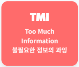 어떤 사건의 결론만 말하면 되는데, 그 과정에 들어간 불필요한 부연 설명들이 모두 TMI에 해당합니다. 예를 들어 점심 메뉴를 고르는 상황에서 "어제 본 TV 프로그램의 주인공이 먹던 음식의 유래가 사실은..."이라며 설명을 시작한다면 그것은 전형적인 TMI입니다.